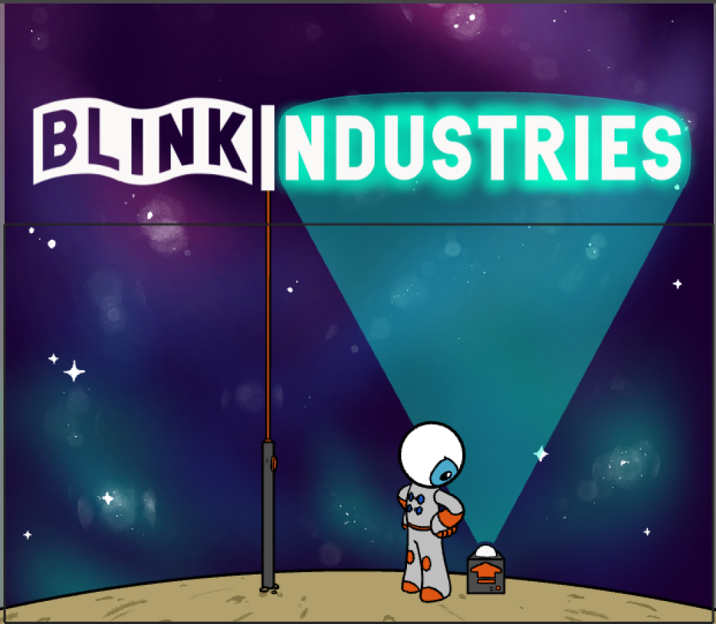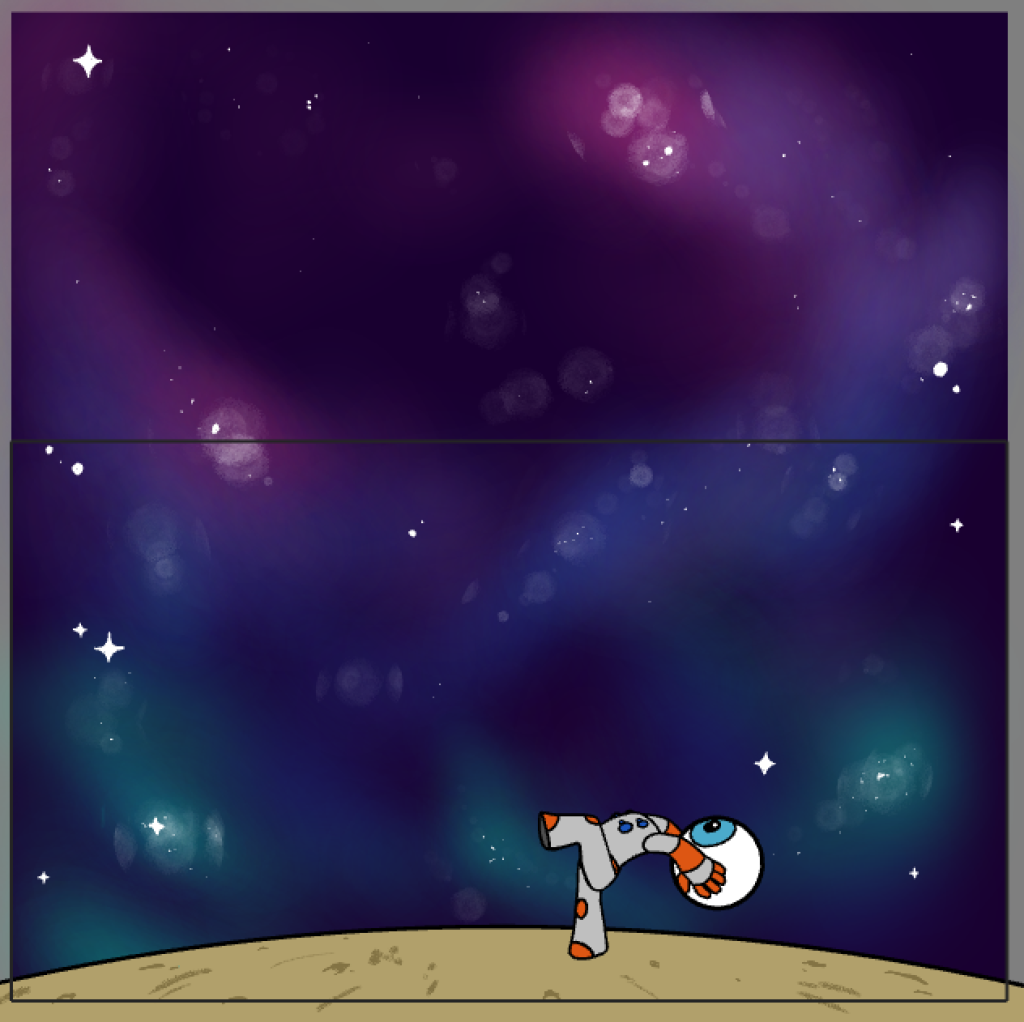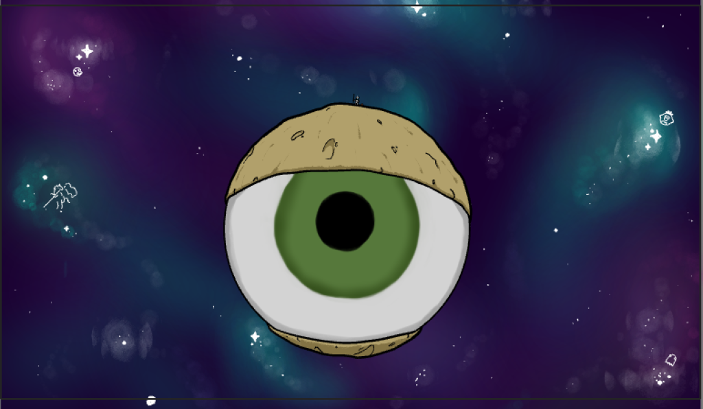 I then made the opening scene with the eye planet, which proved to be fairly simple. I made another background, this time including some references to Blink Industries’ other projects, like the Don’t Hug Me I’m Scared protagonists and their “Ideas Horse” mascot among the stars.
