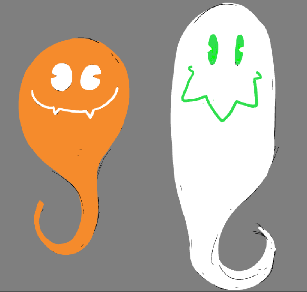 Before moving onto the proper boarding process, I knew I wanted the ghosts to look slightly different from each other, to make them more interesting (both individually and as a duo). I drew these simple designs, and was fairly satisfied with them: my main inspirations were Pac-Man and his own ghosts, as I wanted them to be simple and charming enough to be the main focus of the animation. The colour schemes complemented one another and worked with the limited color palette I’d decided on, and small differences like the eyes and mouth help them look more unique.