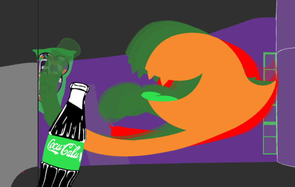 But then came the hard part: I had given it a scene where it grabs the bottle of Coca-Cola, opens its mouth, lifts it up to drink it, and then eats the bottle and retracts its arm back into its body as it turns around to enter the museum’s window. When boarding, I hadn’t realized how difficult this would be to pull off, and I definitely got nervous when the time came to rough out the animation.
