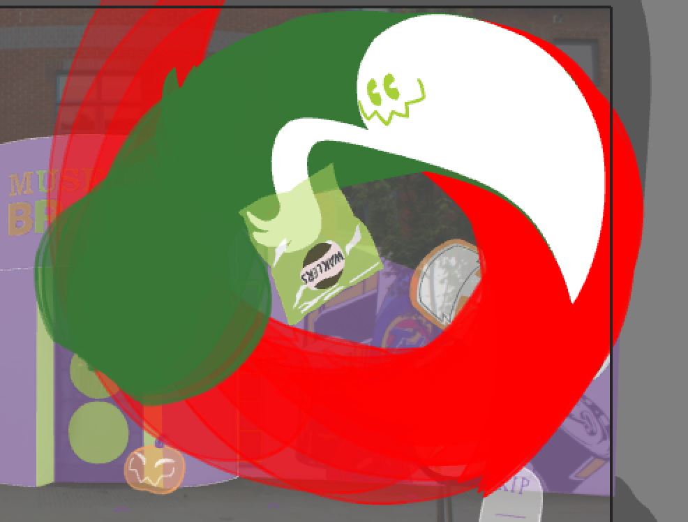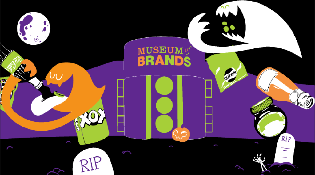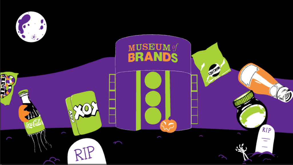 Next, I tried enhancing the background, following the client’s feedback. I added one more product on the left (An OXO tin), a full moon (believing it to be both spooky and cool imagery), and a jack-o-lantern and tombstones on the floor (with a skeleton’s arm sticking out from under one). I also made the museum’s title colours switch intermittently, just because I thought it’d be fun, and maybe add a bit of movement to the whole thing.