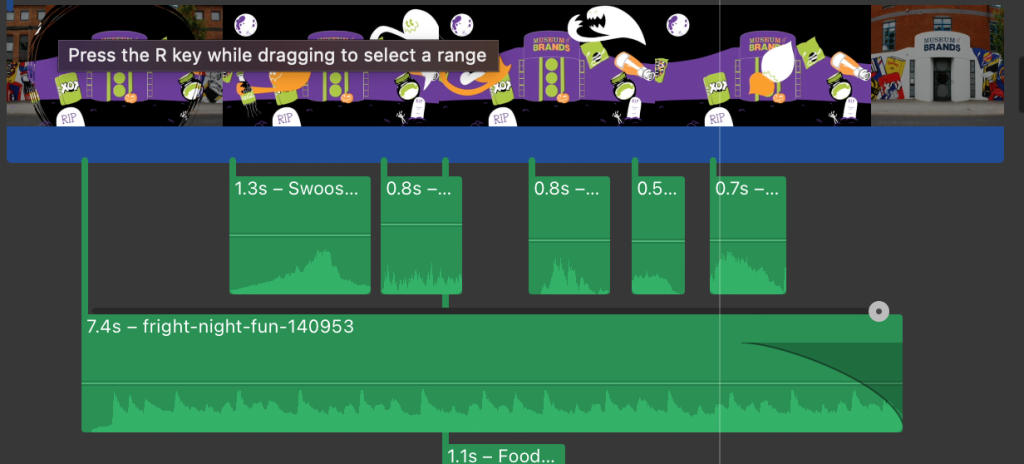 The only sound I had to look elsewhere from was the background music. As with my Blink Industries project, I knew I needed some kind of tune to go along with the sound effects, or else the scene would feel really quiet and weird. I found a few tracks on Pixabay that could fit, and eventually settled on “Fright Night Fun”. It’s very light-hearted but with a cute spooky melody that fits well with the imagery.